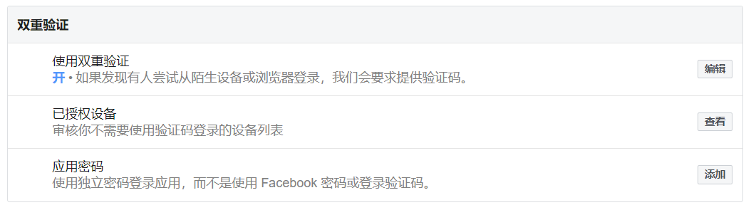 双重验证是一种安全保护功能,可在密码保护的基础上为Facebook 帐户提供额外安全保护,提高个人账户的安全性。如果设置了双重验证,那么当有人尝试从陌生浏览器或移动设备访问 Facebook 时,需要用户输入特殊的登录验证码或确认登录。还可以在有人尝试从陌生浏览器或移动设备登录时接收提醒。