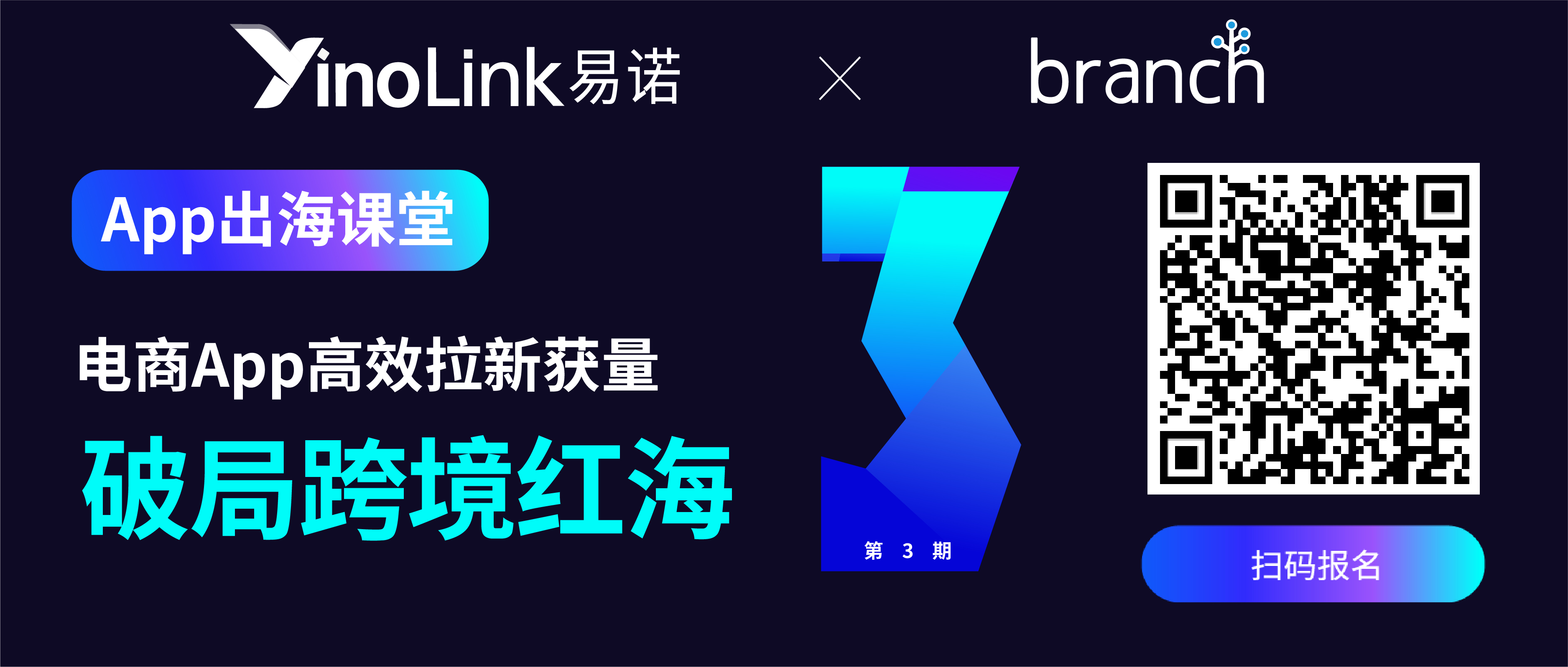 2022年5月26日下午15:00-16:30,YinoLink易诺邀请移动链接及效果衡量平台Branch携手为大家带来APP出海课堂第3期:电商APP高效拉新获量,破局跨境红海。