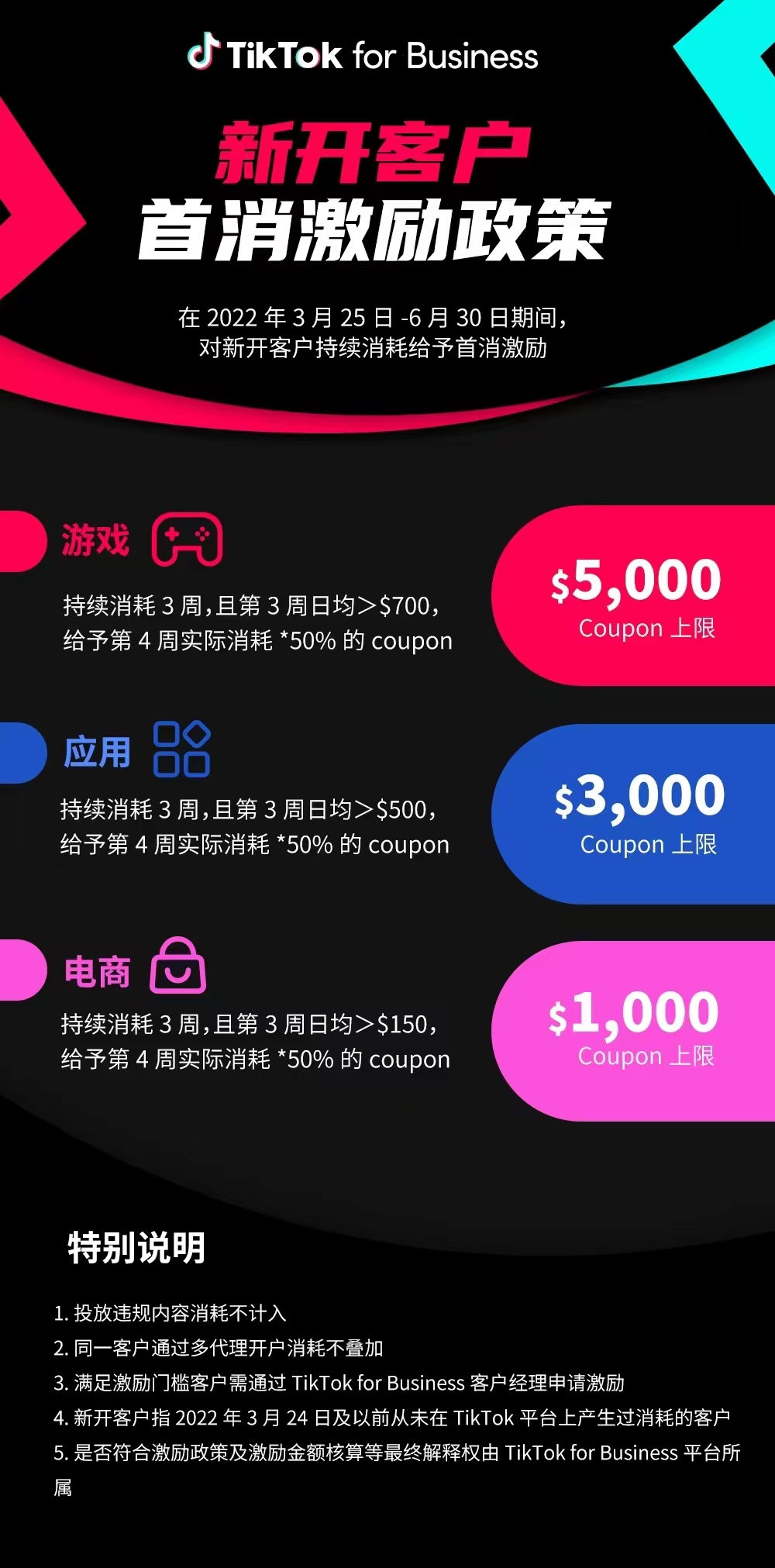 针对2022年3月25日至6月30日期间新开广告账户的客户,TikTok for Business出海业务设置了不同广告费的消耗奖励。电商、应用、游戏行业都可以参与,最高奖励金达5000美金!
