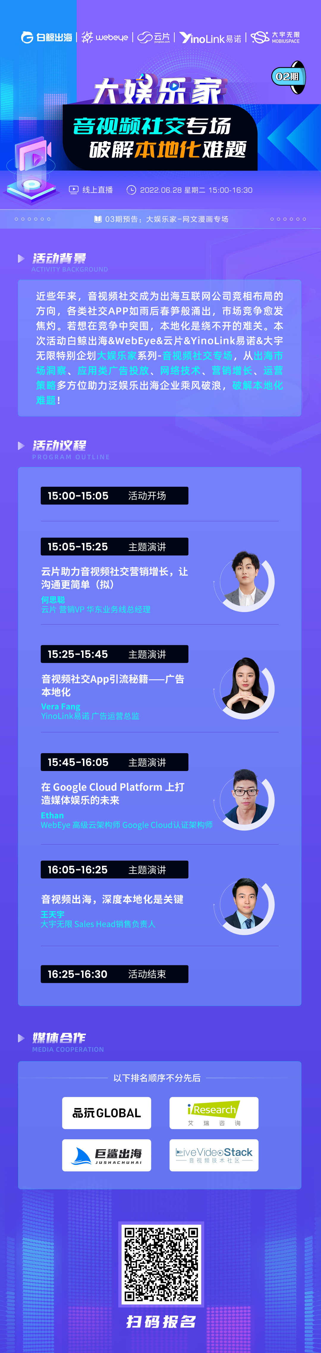 针对游戏&泛娱乐出海难题,白鲸出海特别企划【大娱乐家】系列活动。本期直播,白鲸出海携手WebEye、云片、YinoLink易诺、大宇无限共同举办《音视频社交专场,破解本地化难题》线上直播活动。