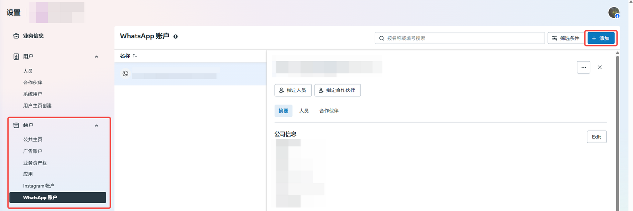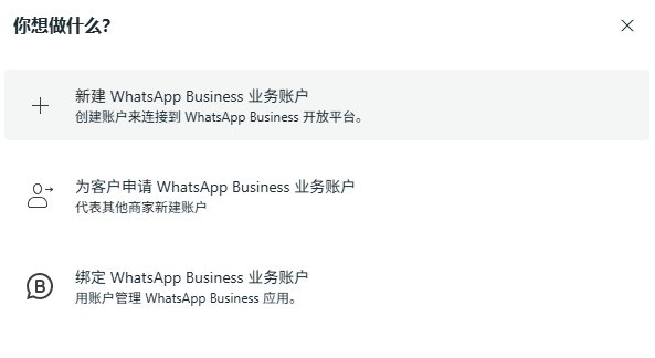 点击蓝色+添加按钮,在下拉菜单中选择新建WhatsApp Business商业账户。