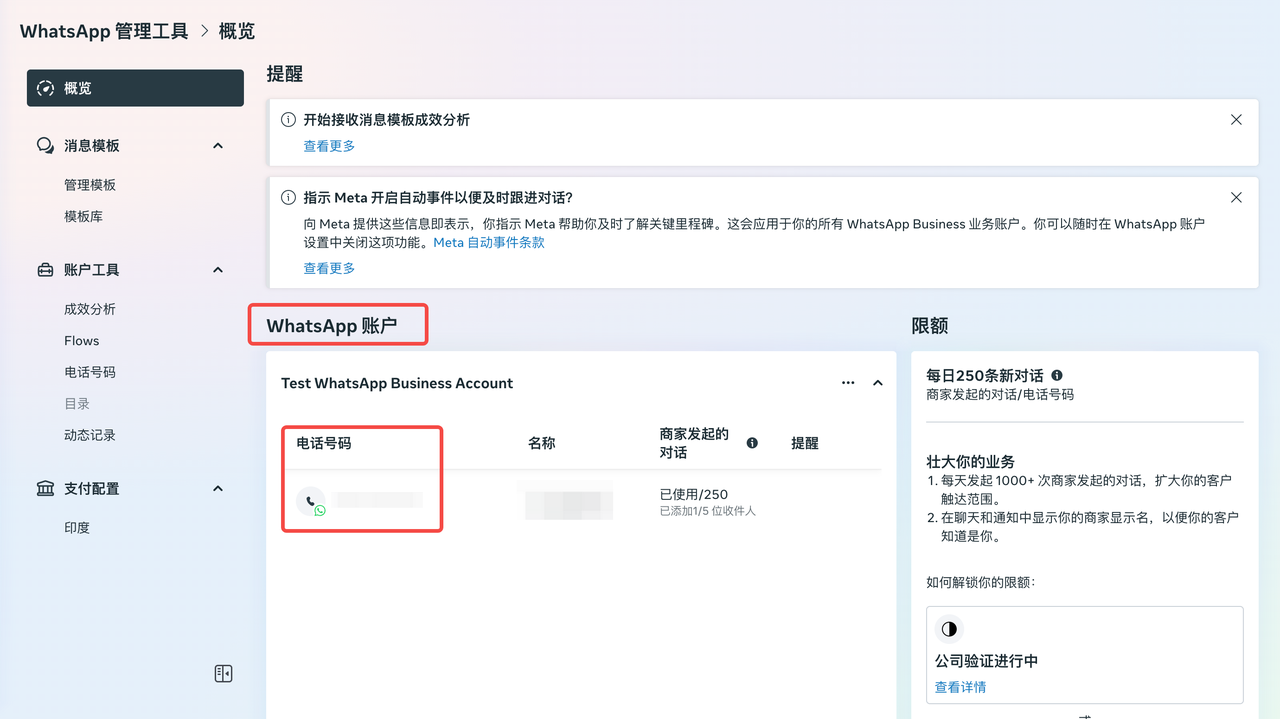 1、访问WhatsApp管理工具—概览—找到点击对应的业务电话号码