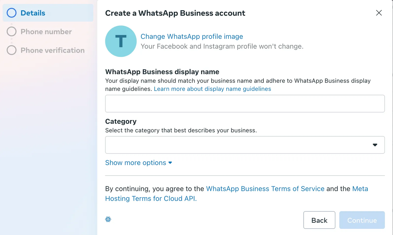 在出现的创建WhatsApp Business商业账户窗口中,完成该流程。