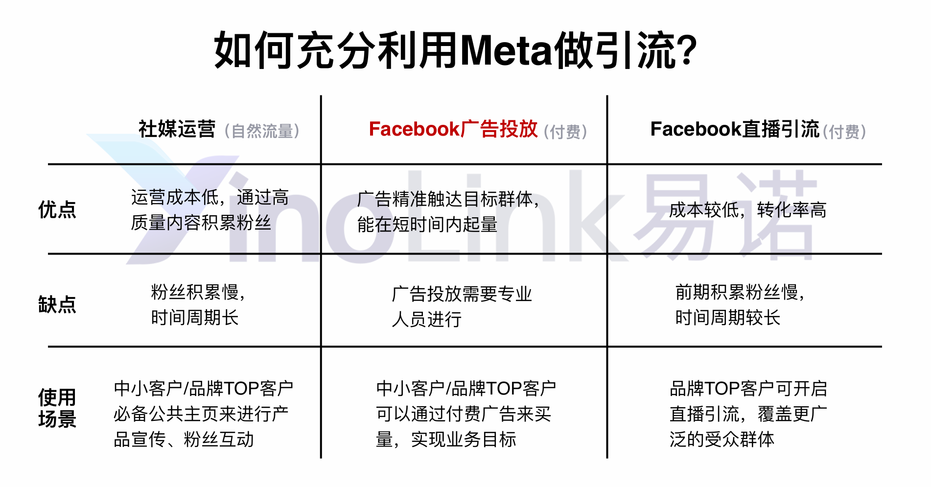 在对于Meta有了基础了解后,想要将流量转化为业务增长,只靠单一打法往往很难快速实现销量爆单,可以考虑将自然流量、付费广告与直播引流整合,才能形成引流闭环。三种路径分别对应不同阶段的运营目标,广告主可以按照目前所处的阶段以及需求来进行选择。