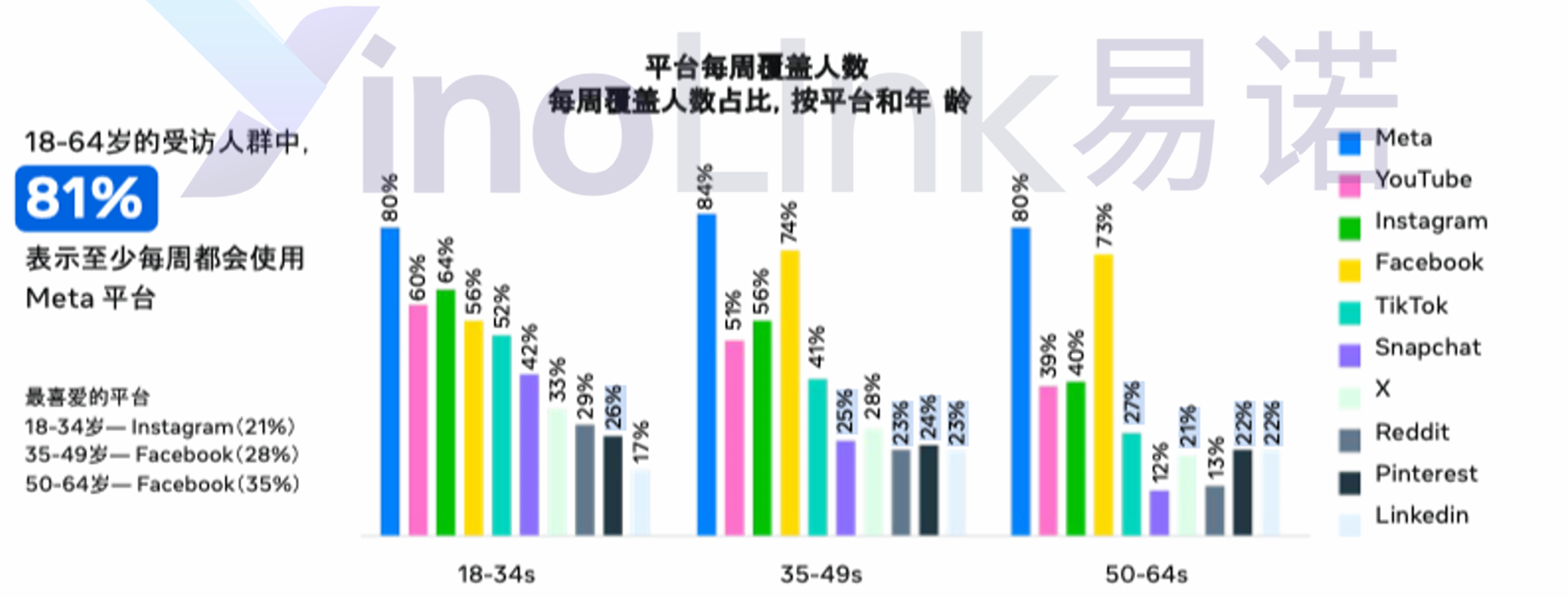 1、用户基础庞大,覆盖各年龄段:在18-64岁的受访人群中,有81%的用户表示至少每周都会使用Meta平台。