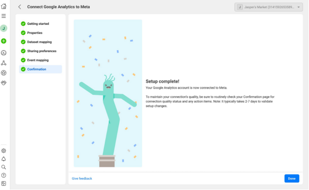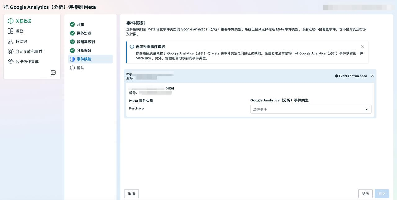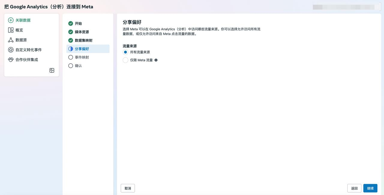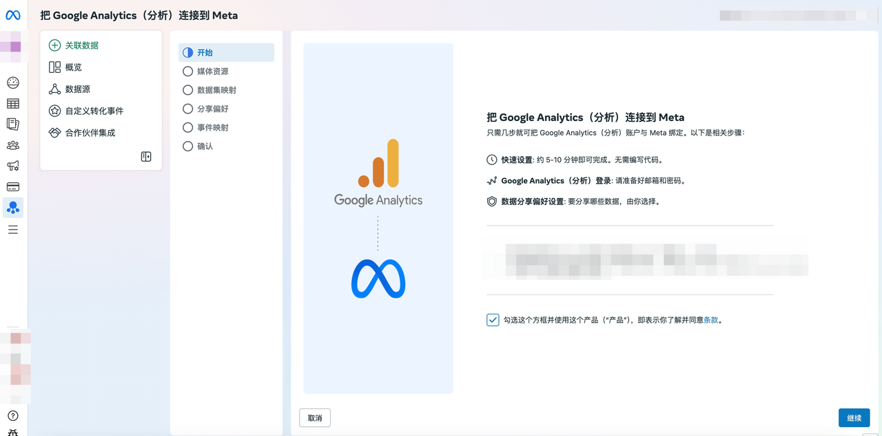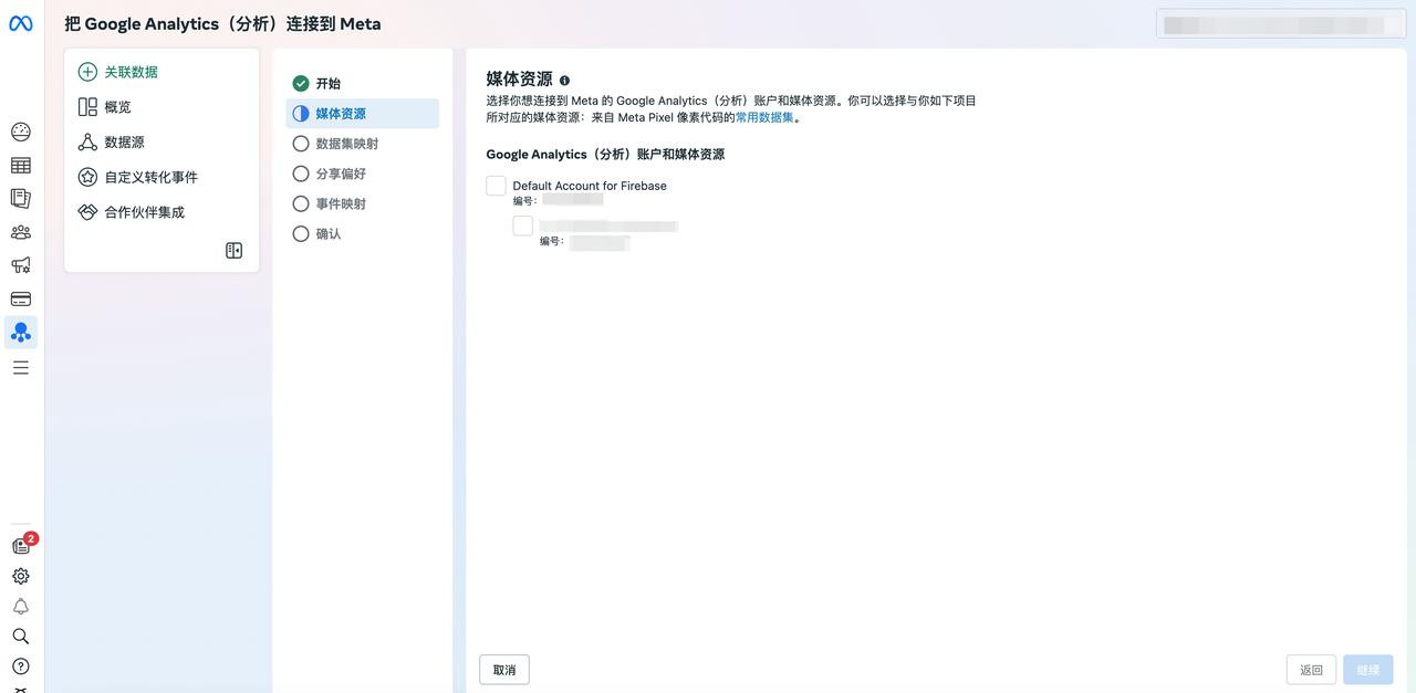5、选择资产或账户:在完成上述步骤后,广告主将会被引导回事件管理工具,在那里可以选择要连接到Meta的Google Analytics账户和资产。