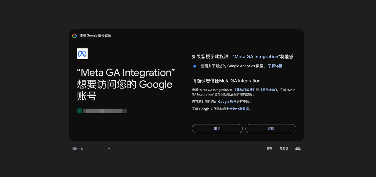 在开始安装之前,广告主需要拥有一个Google Analytics账户(需要具有 Google Analytics(分析)账户的访客或更高级别的访问权限),以及需要准备好电子邮件和密码,以便在设置过程中登录Google Analytics。除此以外,还需要对Meta商务管理平台拥有完全控制权。