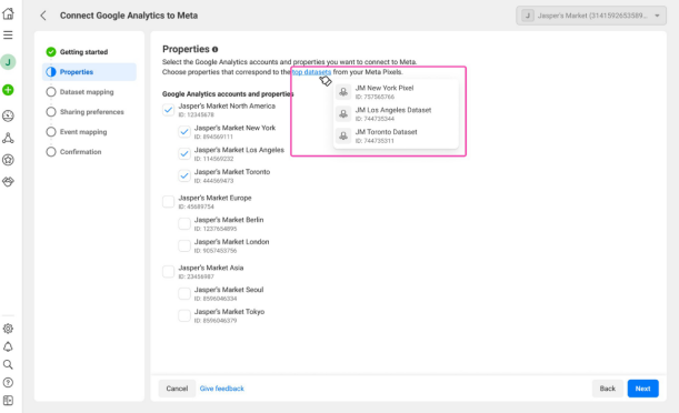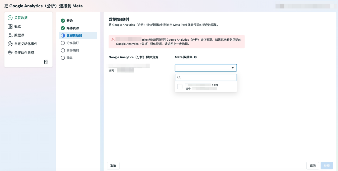 6、选择数据集进行映射:接下来,选择与每个Google Analytics属性相对应的Meta数据集。