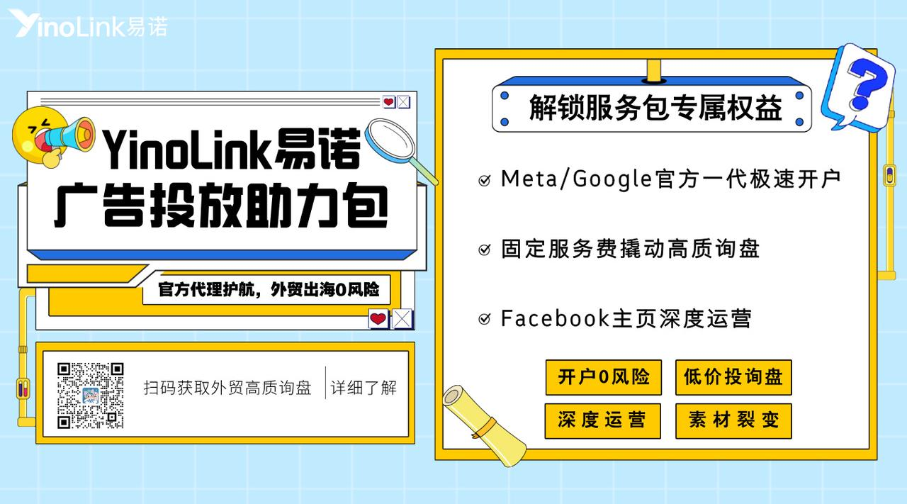 如果您是外贸卖家,YinoLink易诺还能够帮助您解决下户后的基础资产配置,进行Facebook主页运营,更有专业的广告优化师利用增长型投放策略全程替您投放,并定期进行数据复盘。如果您有代投方面的需求,可以联系YinoLink易诺进行咨询噢~