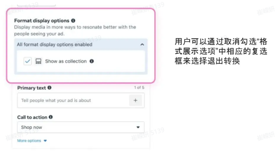答:广告主可以在广告创意版块的“格式展示选项”栏目中取消勾选相应选项,将格式转换功能禁用。Meta官方还将应用“禁用记忆”功能:若用户选择禁用,系统将记住这一选择并在后续广告中遵循该设置。