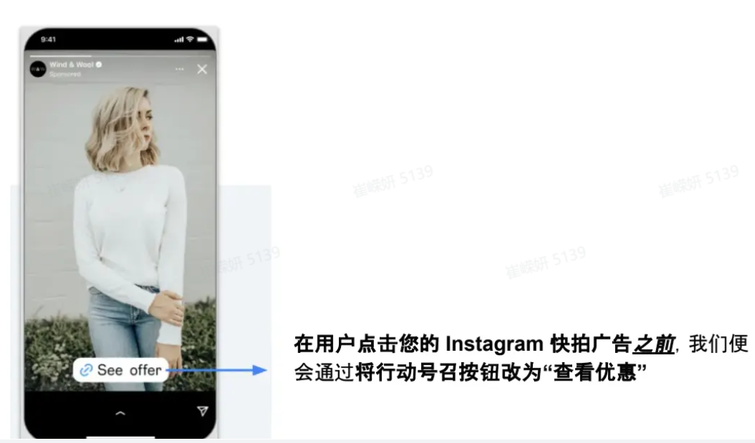 答:除当前已推出的“突显优惠”体验(即在用户点击广告后,于应用内浏览器中展示优惠信息)之外,Meta官方现在还可能在用户点击Instagram快拍广告之前,通过将行动号召按钮改为“查看优惠”来提前提醒用户有可用优惠。
